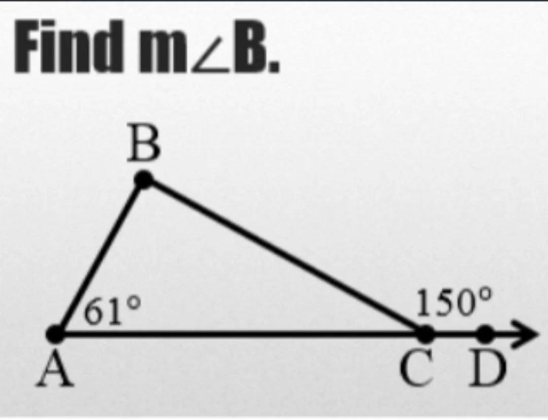 The exterior angle is \(150^\circ\). By the exterior angle theorem, \(61^\circ + \angle B = 150^\circ\). Therefore, \(\angle B = 150^\circ - 61^\circ = 89^\circ\).