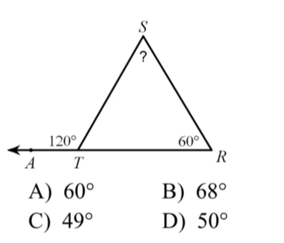 The exterior angle is \(120^\circ\) and one remote interior angle is \(60^\circ\). The missing angle is \(120^\circ - 60^\circ = 60^\circ\).