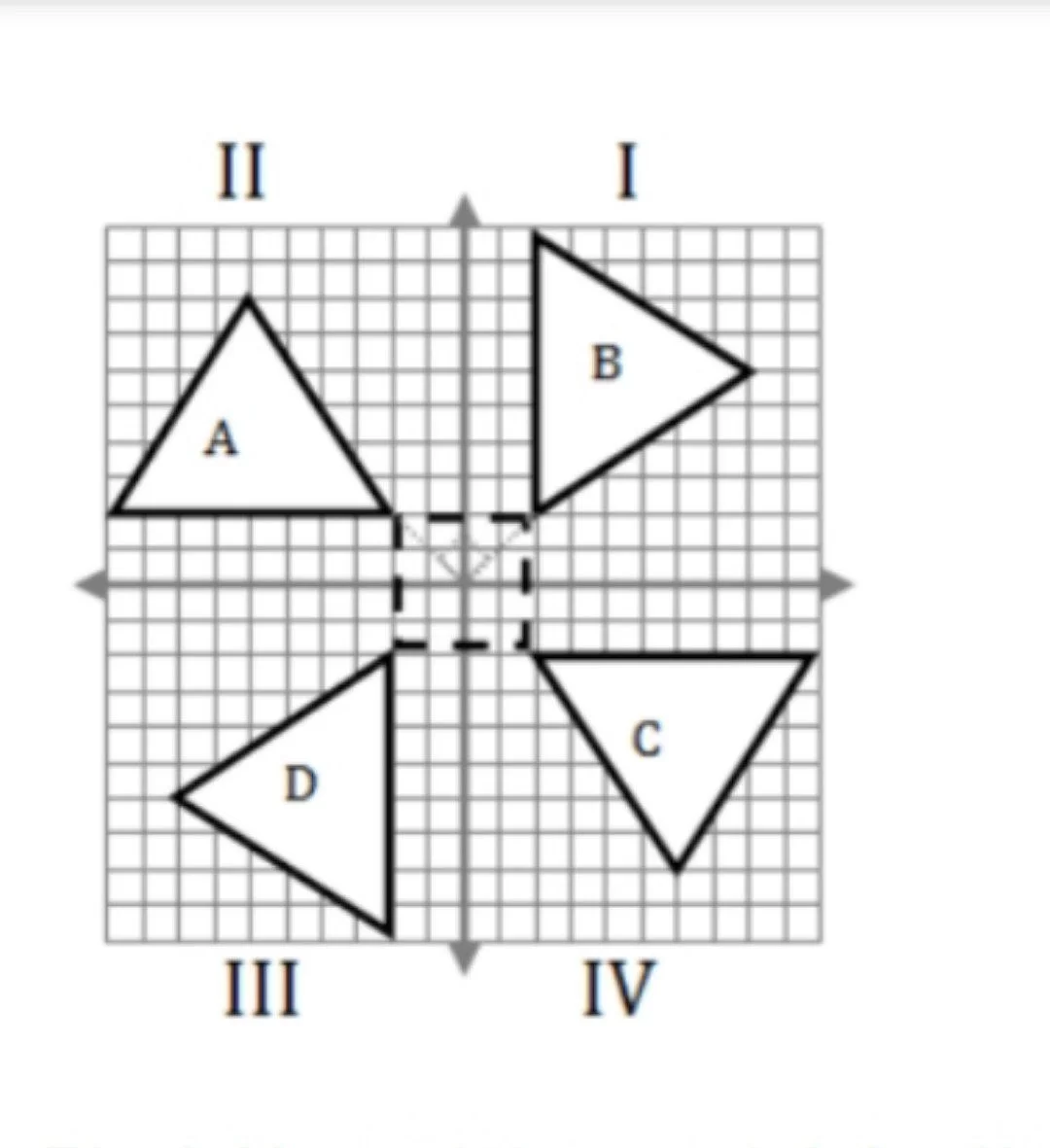 Triangle A is rotated 90° counterclockwise with the origin as the center of rotation to create a new figure. Which triangle shows the new location?