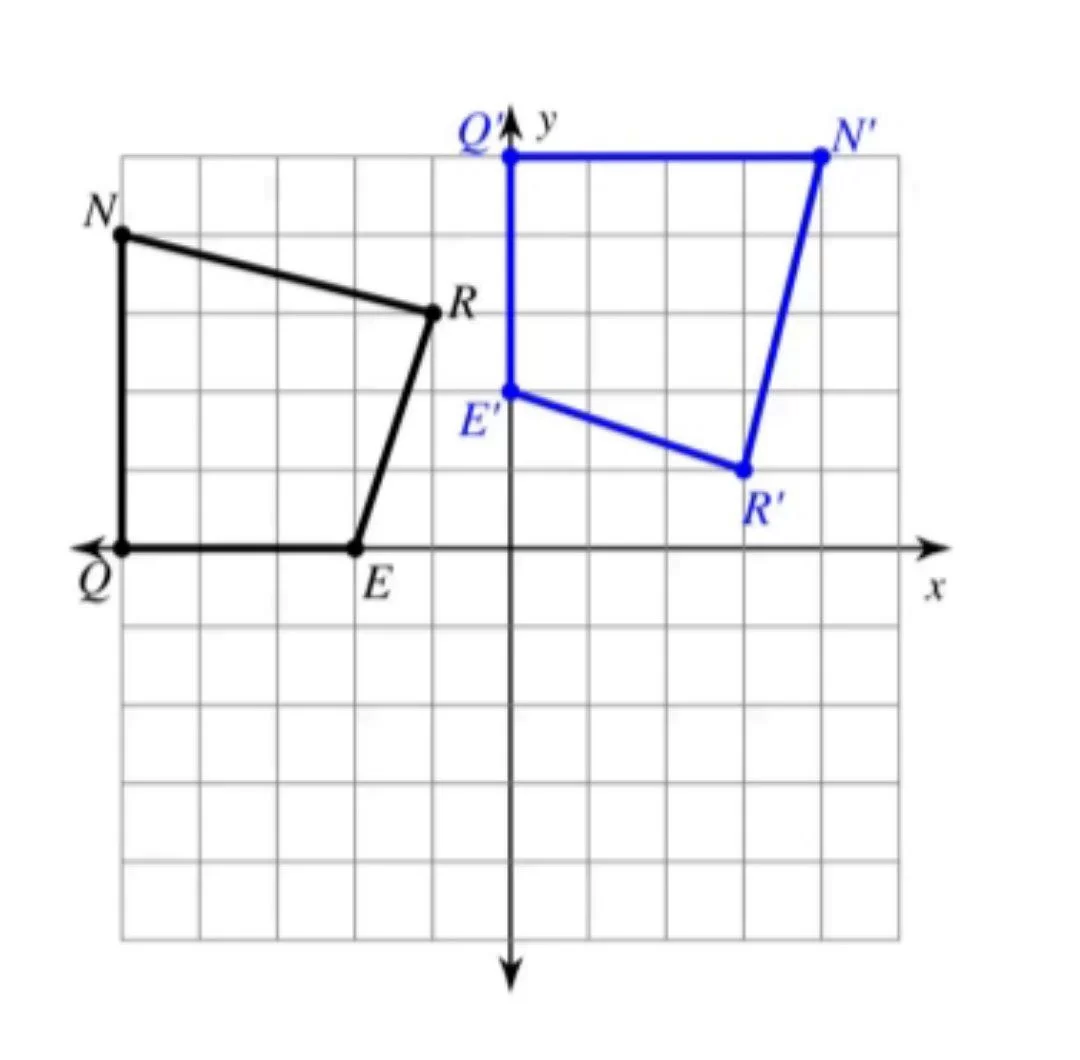 By checking the coordinates of vertex E (-2, 1) and its image E' (1, 2), we see the transformation follows the rule \( (x, y) \rightarrow (y, -x) \), which corresponds to a 90-degree clockwise rotation.