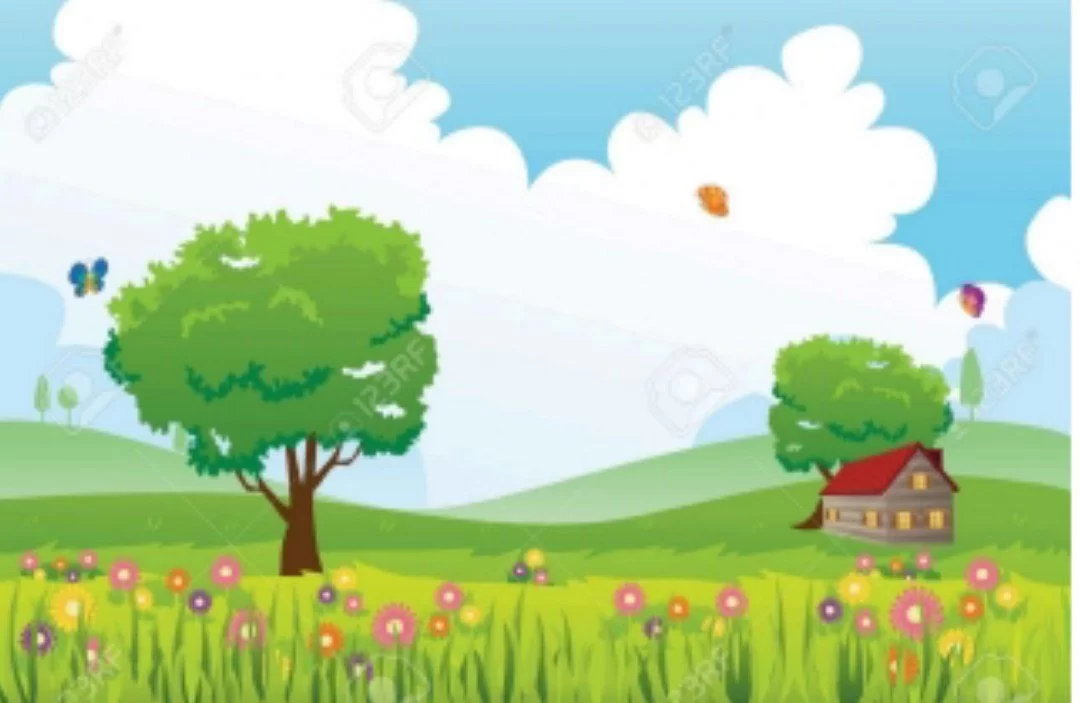 The image shows green fields, blooming flowers, and bright skies, which represents the spring season.