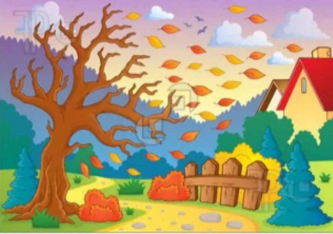 The picture shows a tree with brown/orange leaves falling to the ground, which identifies the season as autumn.