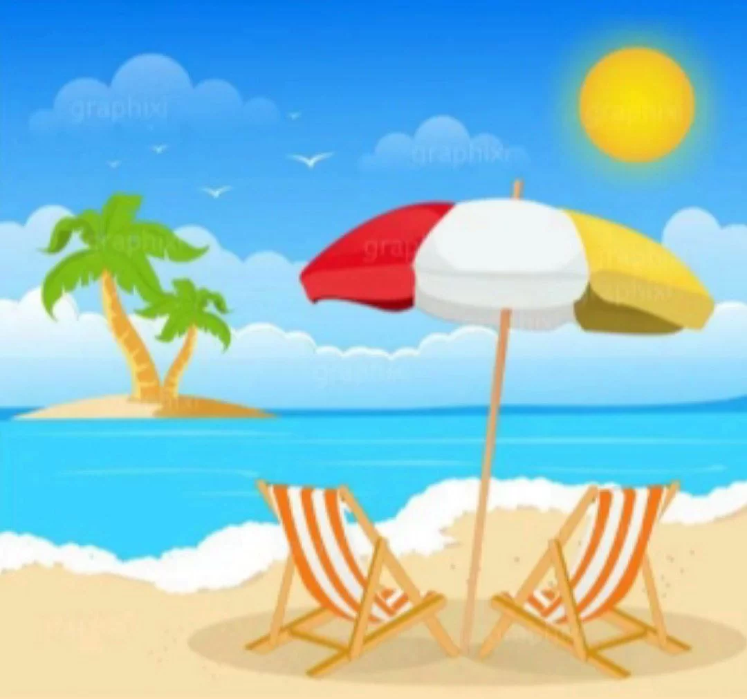 The image of a beach with a bright sun, beach chairs, and an umbrella represents the summer season.