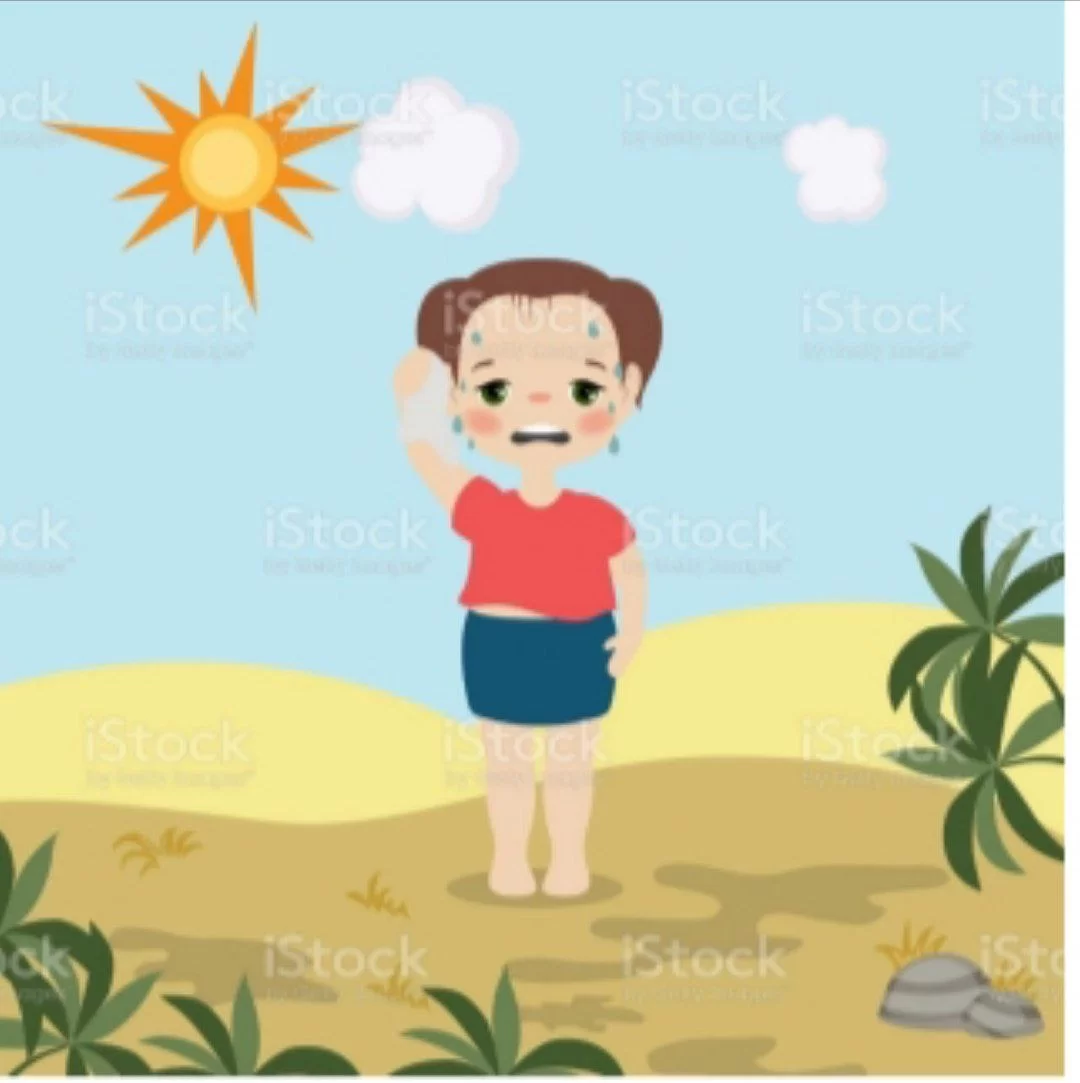 The picture shows a bright sun and a boy sweating at the beach, which indicates it is sunny and hot.