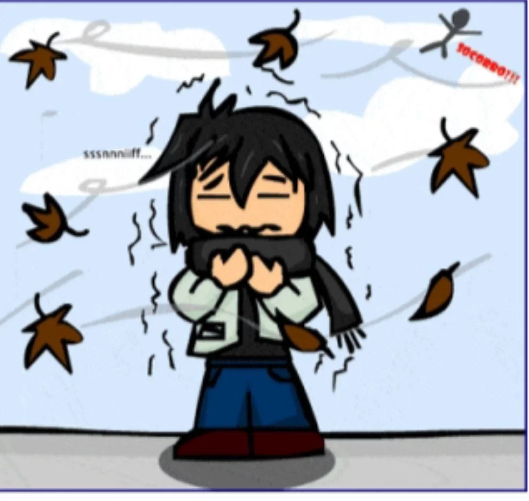 The image shows a boy shivering and leaves flying in the air, which signifies windy and cold weather.