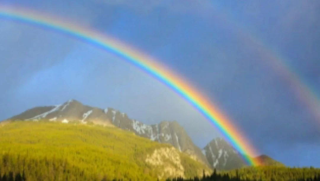 The picture clearly shows a colorful arc in the sky, which is a rainbow.