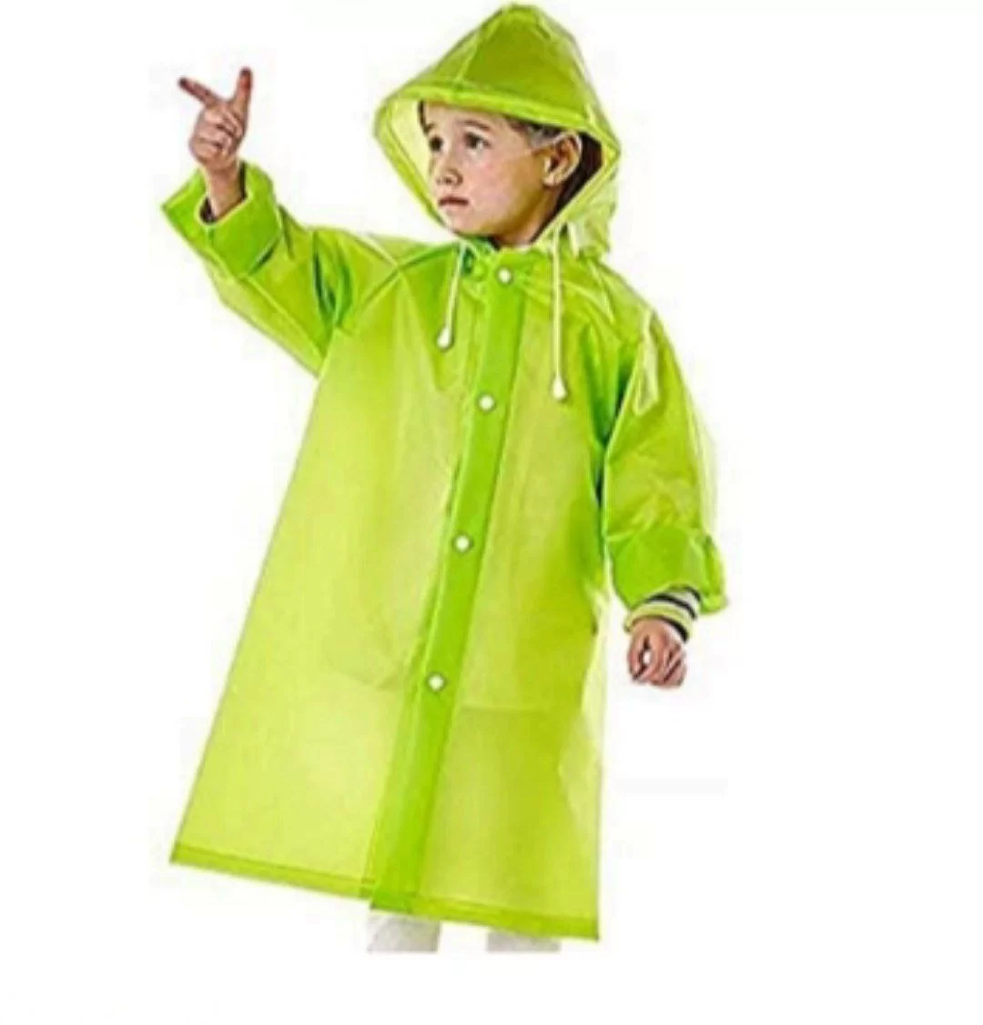 The boy is depicted wearing a bright yellow waterproof garment designed for protection against rain.