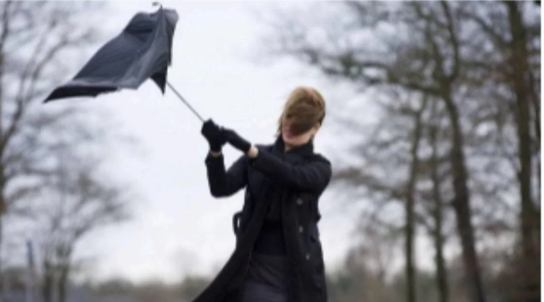 The image shows an umbrella being turned inside out by the force of the air, which indicates windy weather.