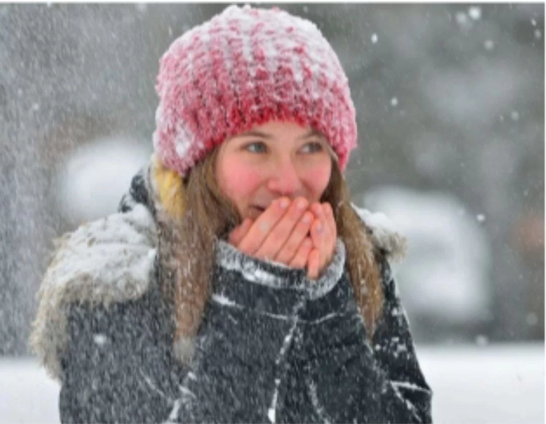 The girl in the image is wearing a warm hat and holding herself as if shivering in the snow, indicating it is cold.