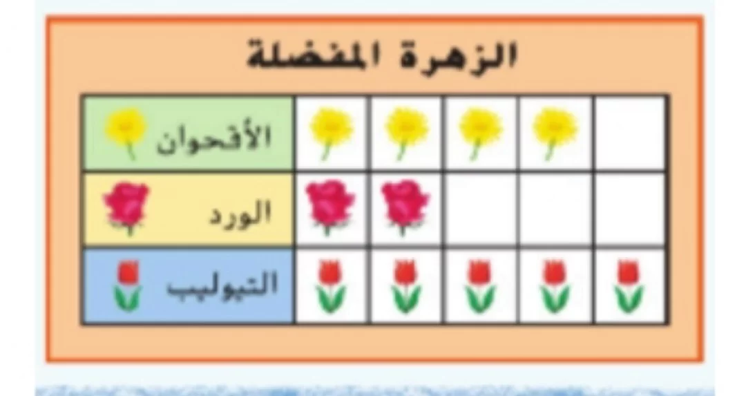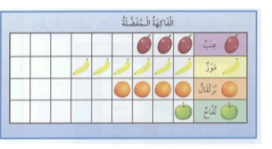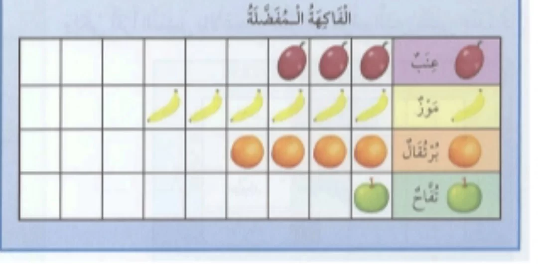 عدد التلاميذ الذين يفضلون الموز هو 4 والذين يفضلون التفاح هو 3، وبجمعهما نصل إلى 4 + 3 = 7.