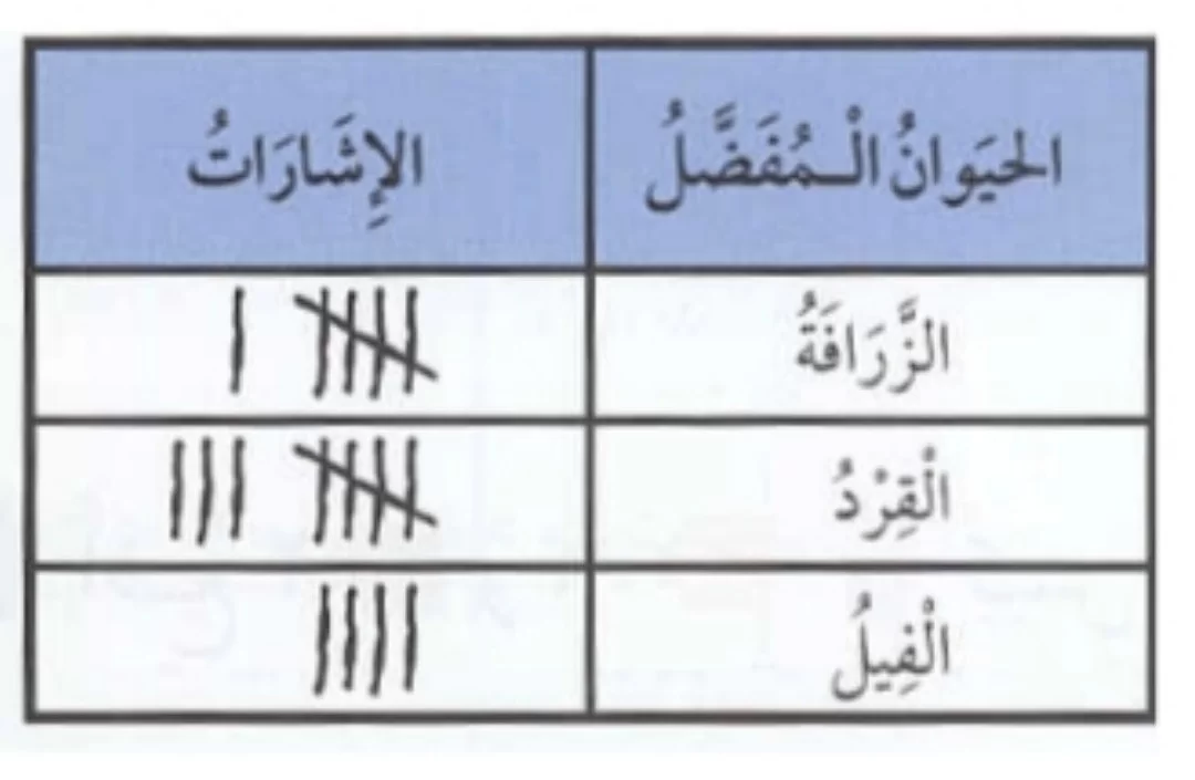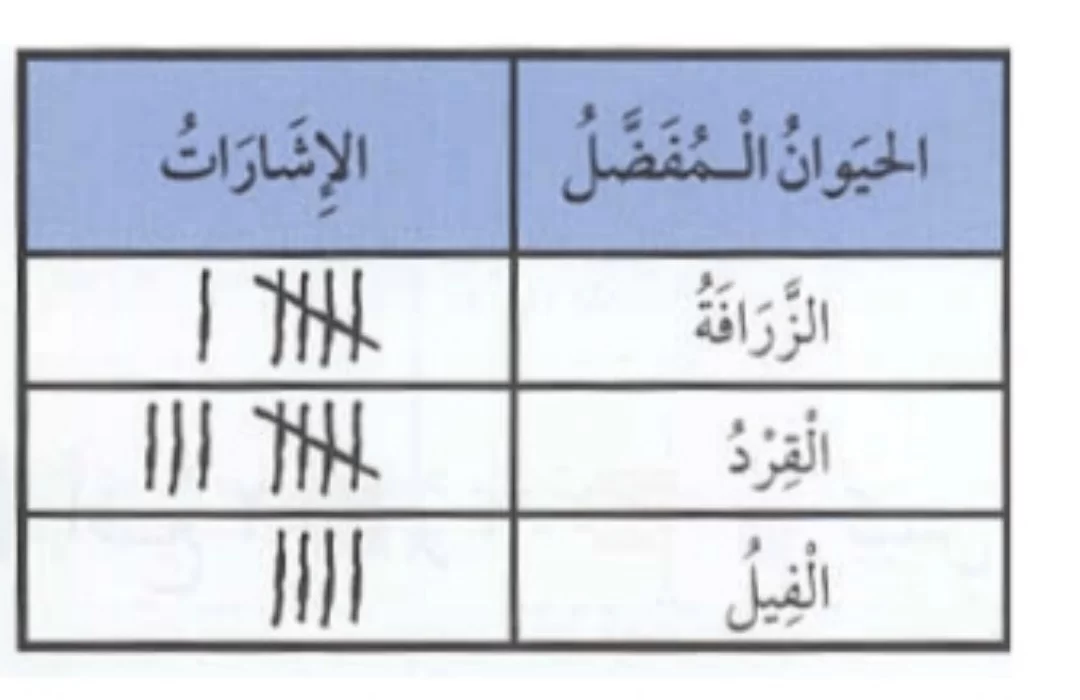 باستخدام علامات العد، يظهر أن القرد حصل على 8 علامات، والزرافة 6 علامات، والفيل 4 علامات، مما يجعل القرد هو الأكثر تفضيلاً.