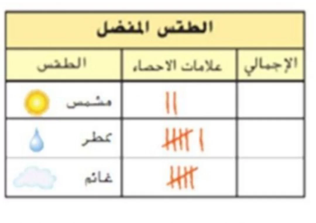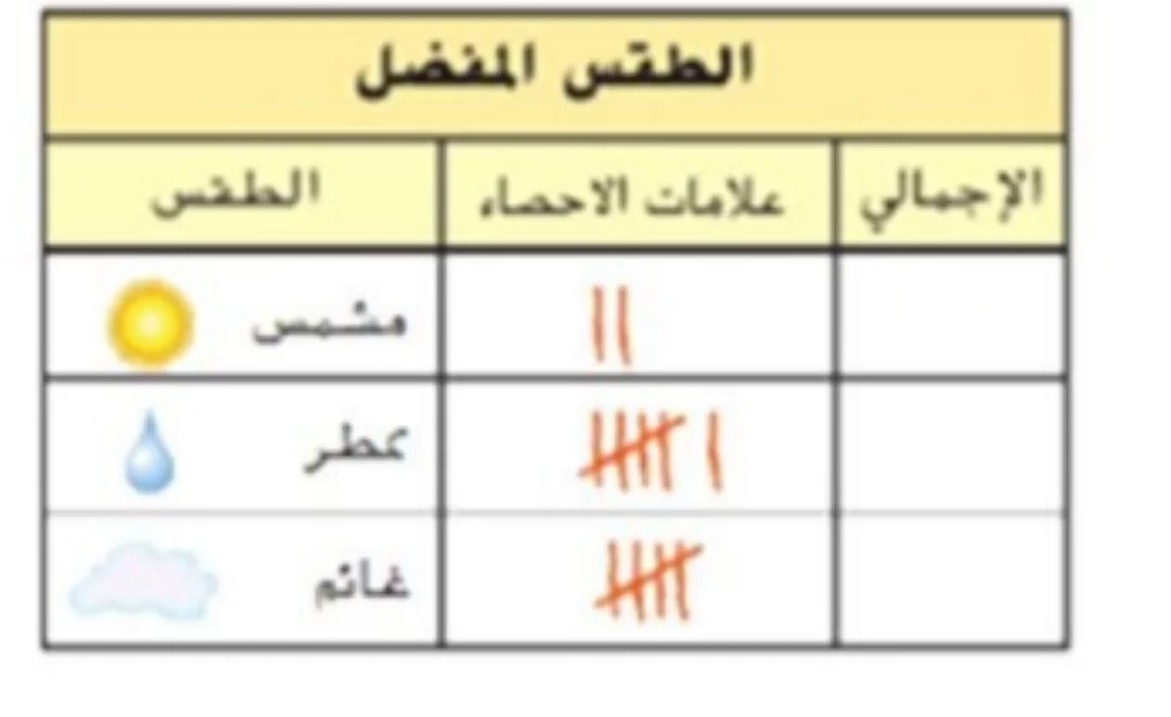 يوضح جدول علامات العد وجود علامتين فقط بجانب الطقس المشمس.