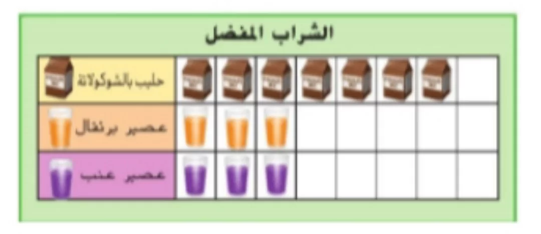 عدد الذين يفضلون الحليب بالشوكولاتة هو 7، وعدد محبي عصير البرتقال هو 3. الزيادة هي 7 - 3 = 4.