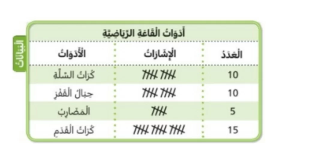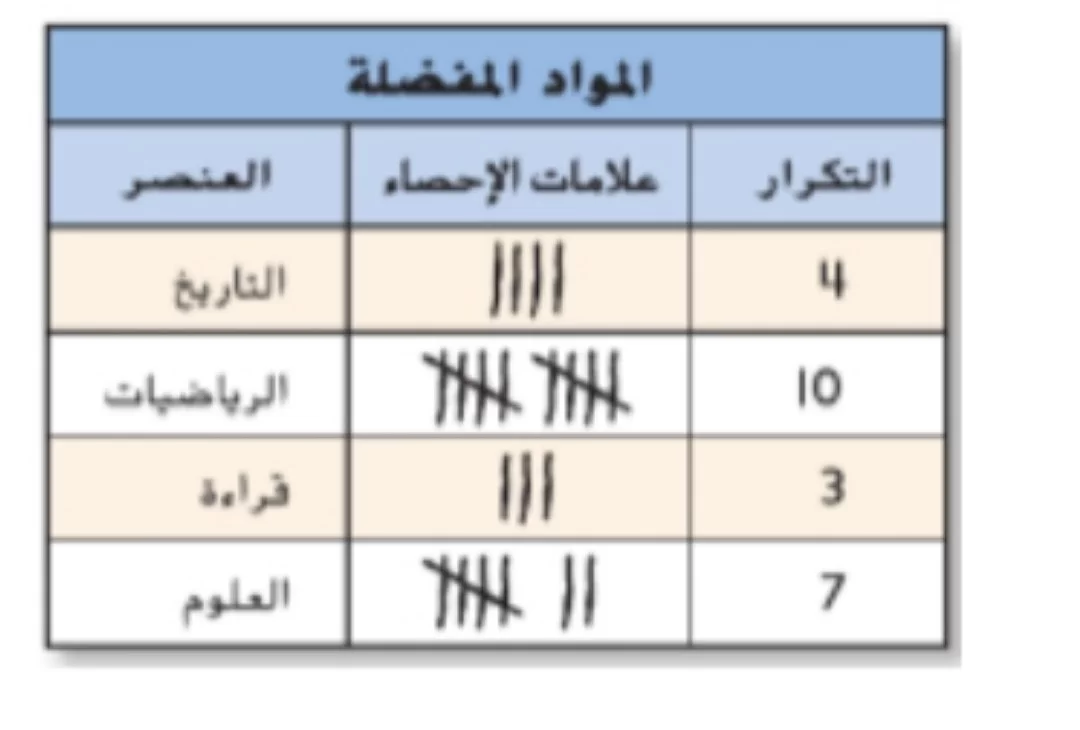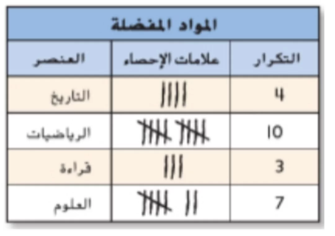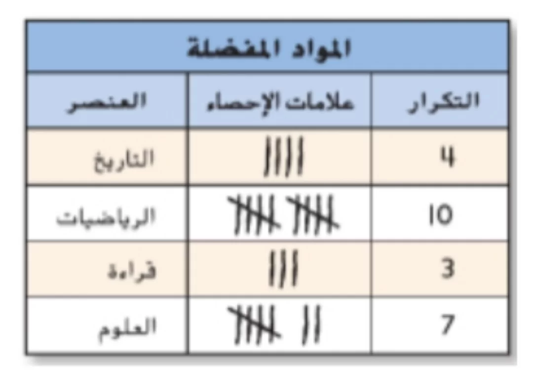 بمقارنة أعداد التكرار في الجدول، نجد أن مادة الرياضيات سجلت أعلى تكرار وهو 10، مما يجعلها المادة الأكثر تفضيلاً.