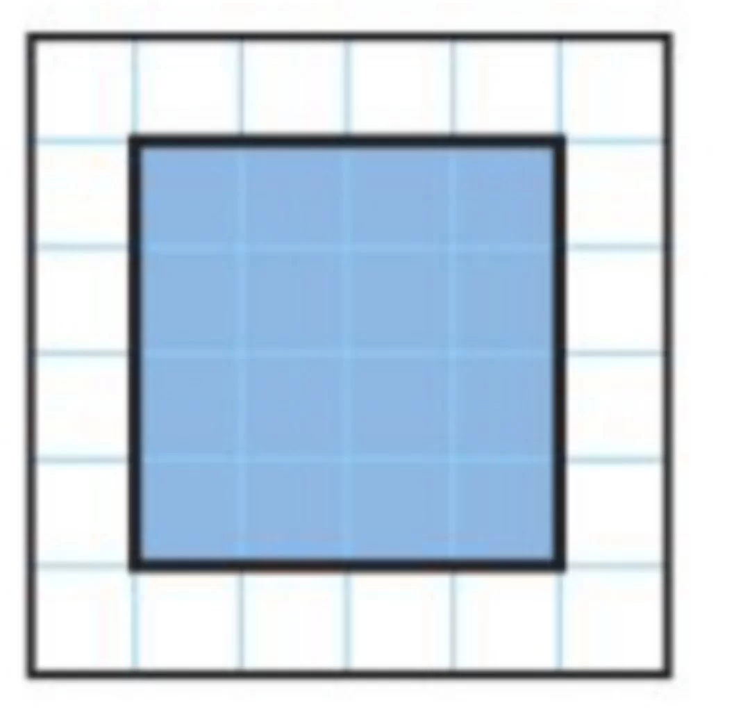 الجزء المظلل هو مربع طول ضلعه 4 وحدات، وبما أن مساحة المربع هي الضلع في نفسه، فإن المساحة تساوي \(4 \times 4 = 16\) وحدة مربعة.
