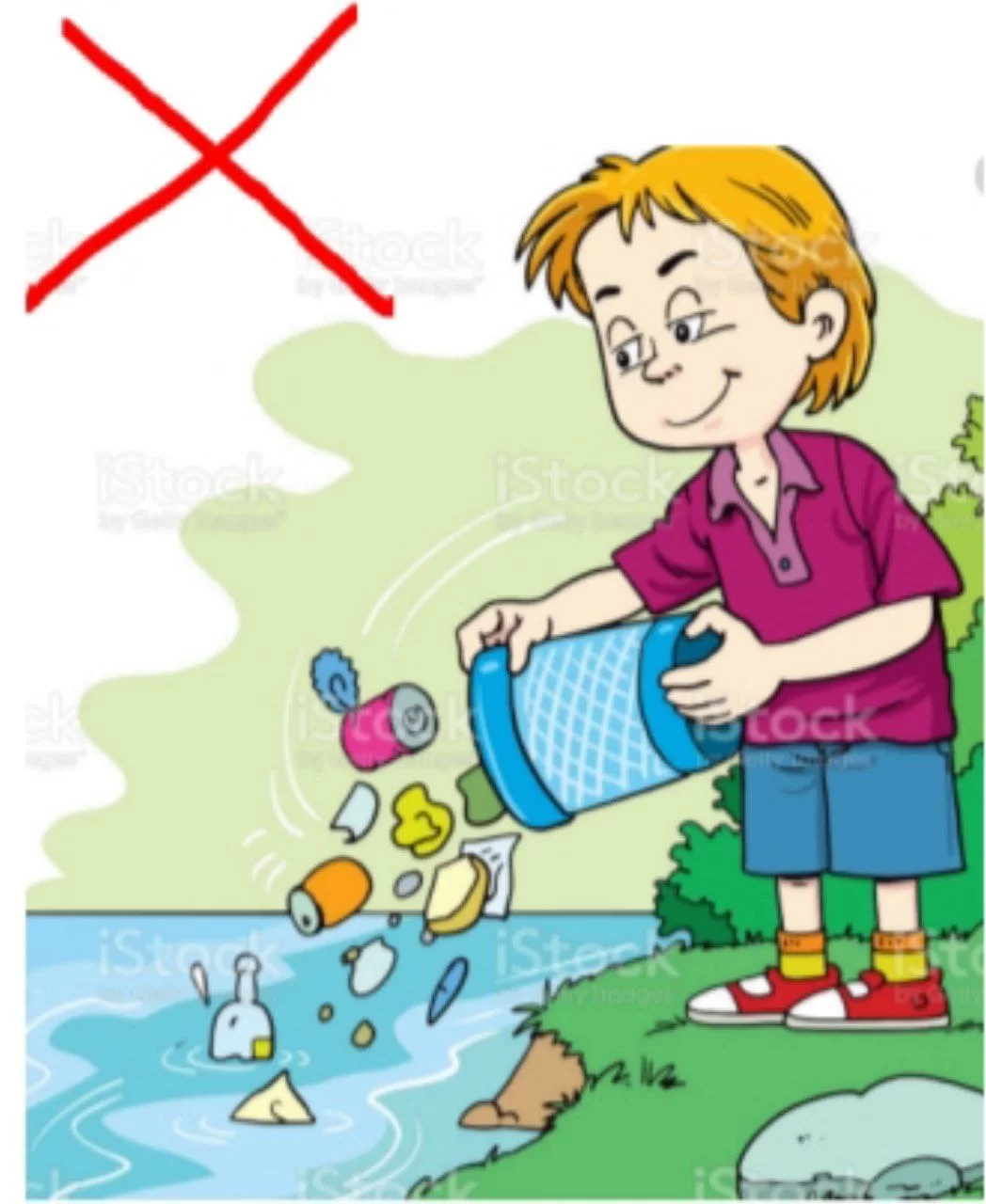 The picture depicts someone being advised against throwing trash into a river, as littering can block water flow and contribute to flooding.