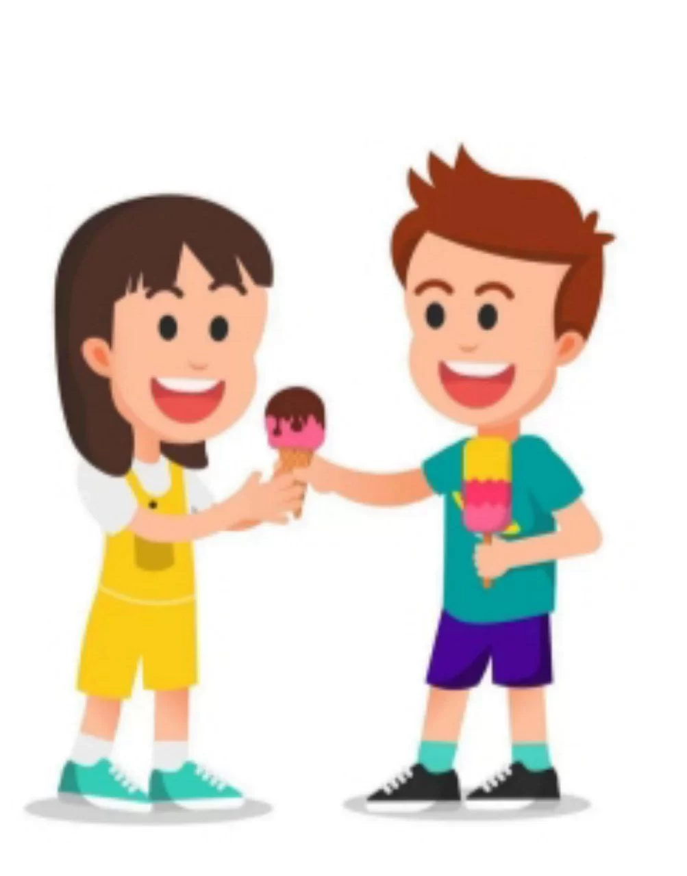 The image shows children sharing an ice cream. The past simple form is 'shared'.