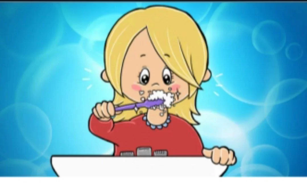 The image shows a girl brushing her teeth. Grammatically, with 'she', the verb 'brush' takes the '-es' suffix.