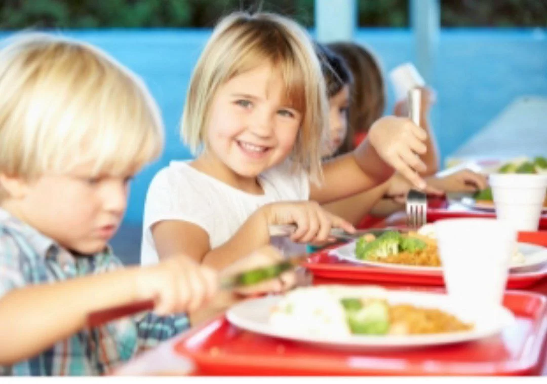 The image shows children eating together in a cafeteria setting, which indicates they are having lunch at school.
