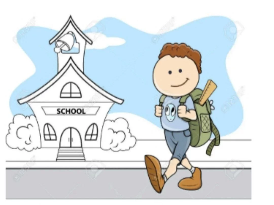 The image shows a boy with a backpack walking near a school building, representing going to school.