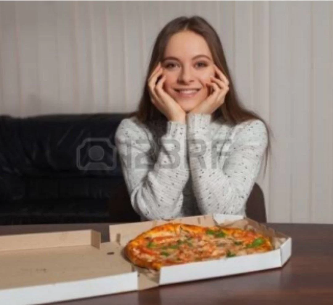 The woman in the image is holding a pizza, and the question specifically asks what she has for dinner.