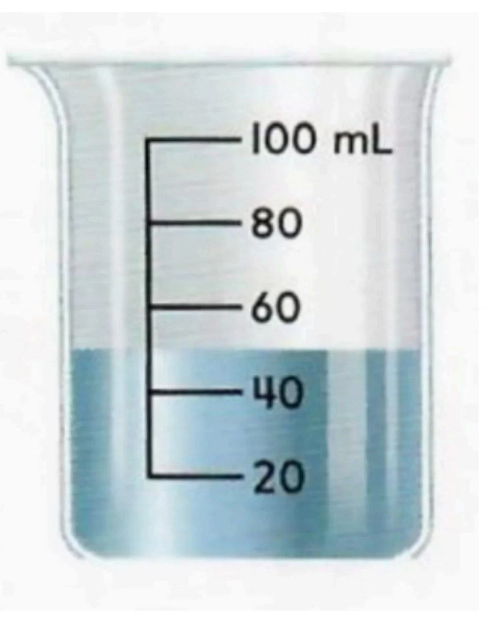مستوى السائل في الوعاء يقع في المنتصف تماماً بين العلامتين 40 و 60، مما يعني أن كمية الماء هي 50 مللتر.