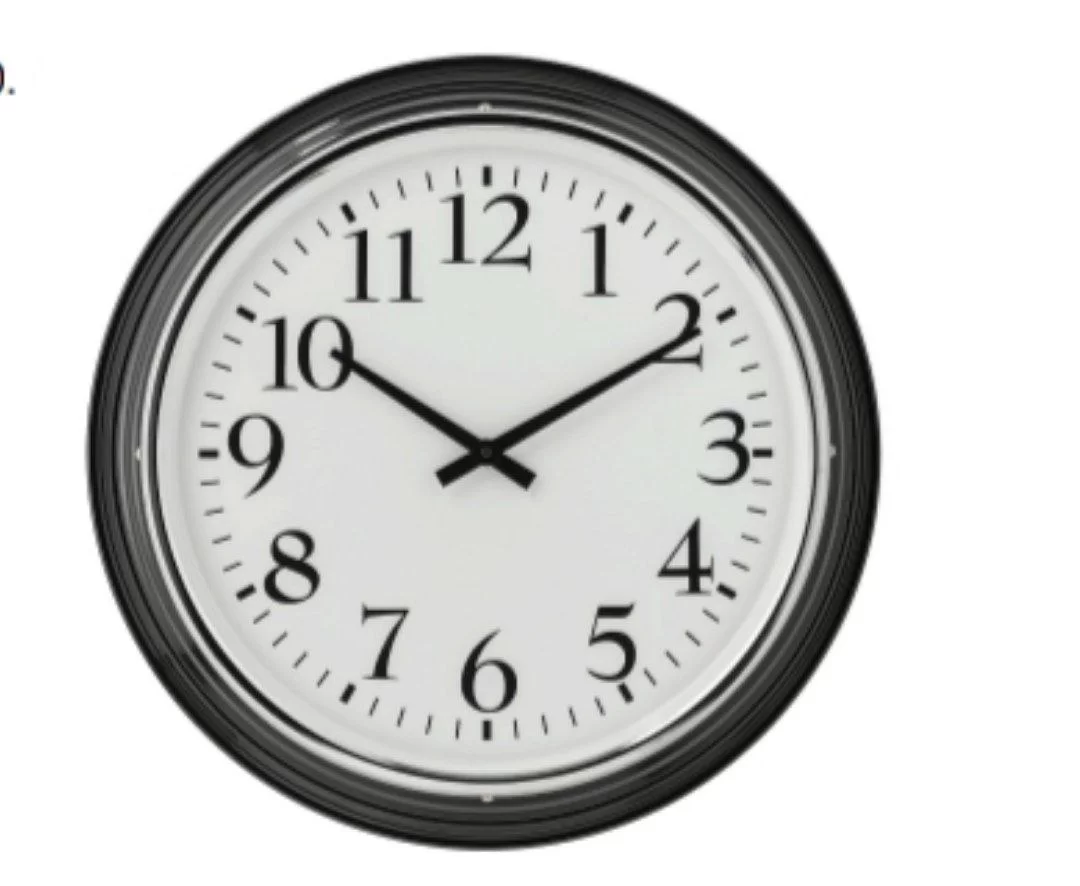 عقرب الساعات يشير إلى الرقم 10، وعقرب الدقائق يشير إلى الرقم 2 (والذي يمثل 10 دقائق)، إذن الوقت هو العاشرة وعشر دقائق.