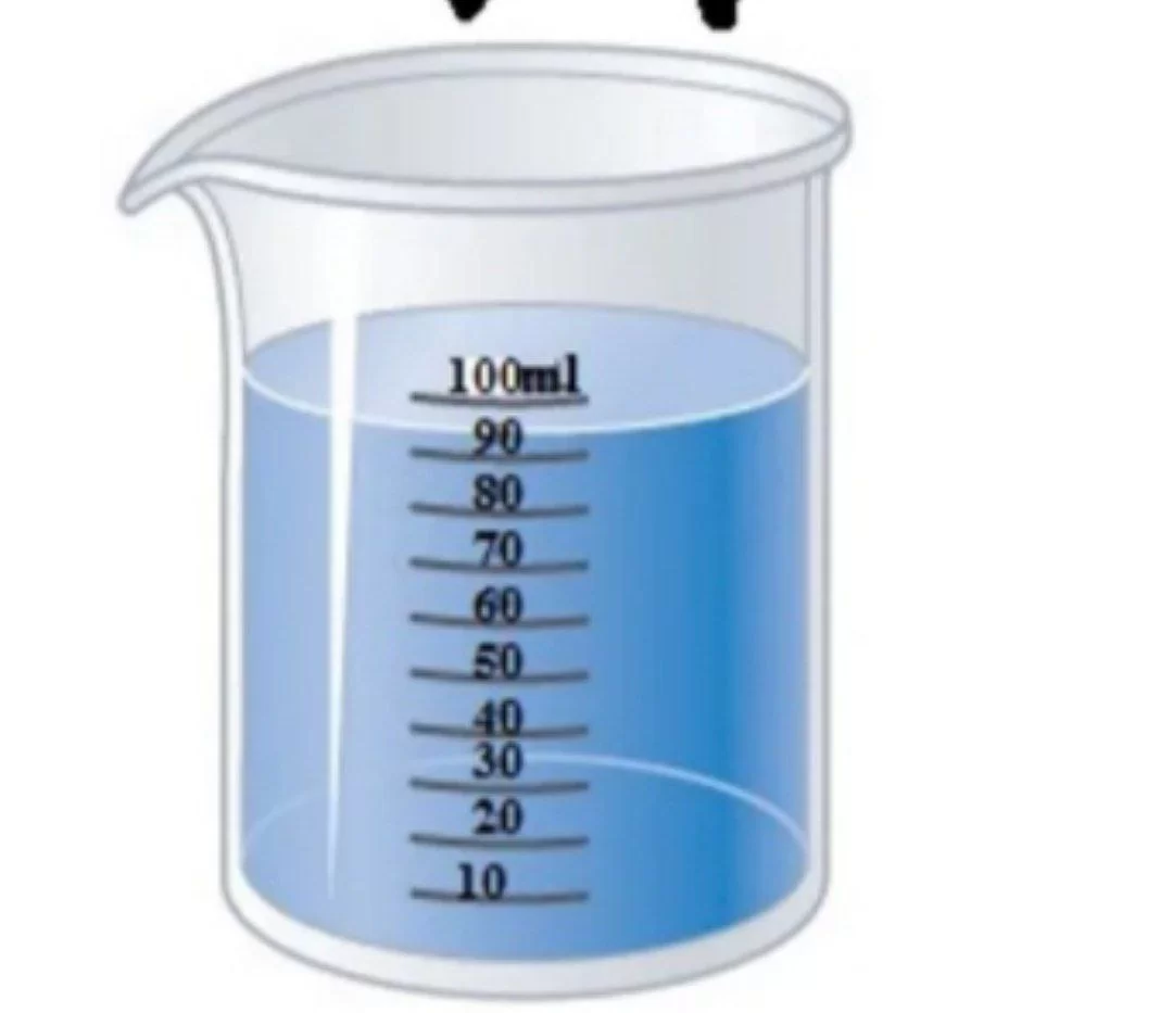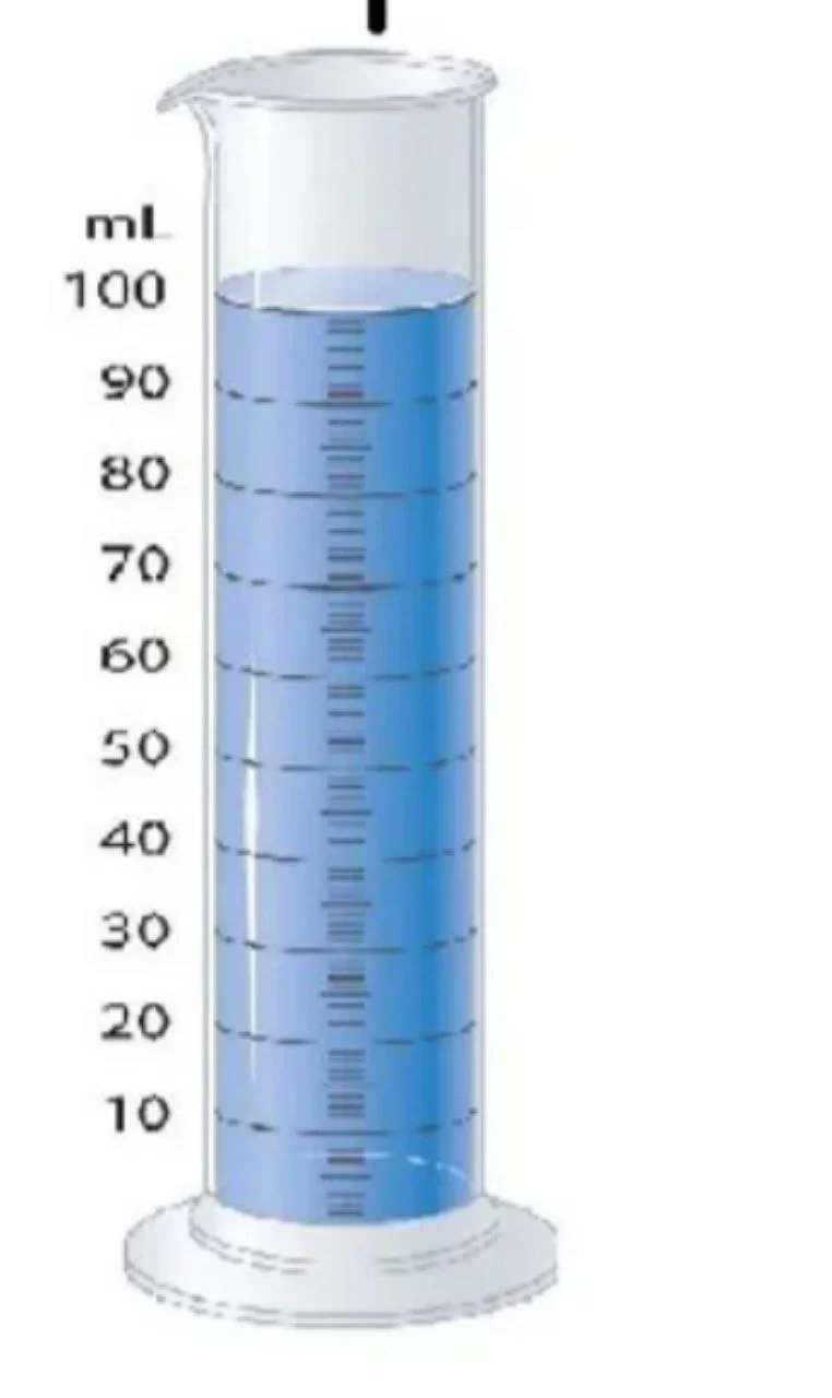 بالنظر إلى المخبار المدرج في الصورة، نجد أن مستوى السائل الأزرق يتوقف تماماً عند العلامة التي تشير إلى الرقم 100، والوحدة المستخدمة هي الملليلتر (mL).