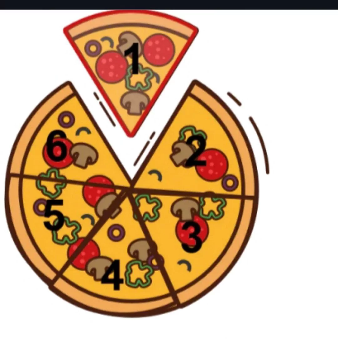 يظهر من الترقيم في الصورة أن البيتزا مقسمة إلى 6 أجزاء، والقطعة المأخوذة رقم (1) تمثل سدس البيتزا.