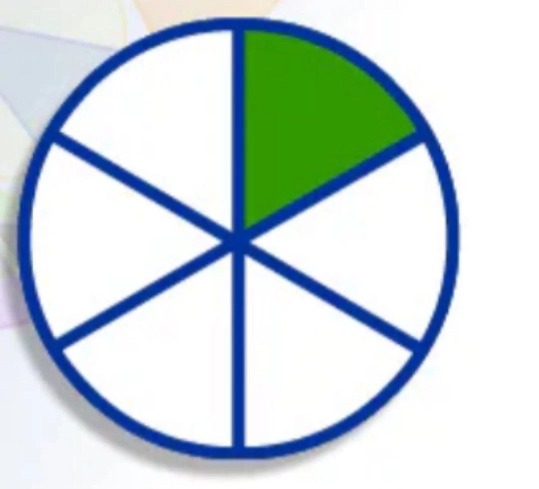 الدائرة مقسمة إلى 6 أجزاء متساوية، والجزء المظلل بالأخضر يمثل جزءاً واحداً من ستة، أي \(\frac{1}{6}\).