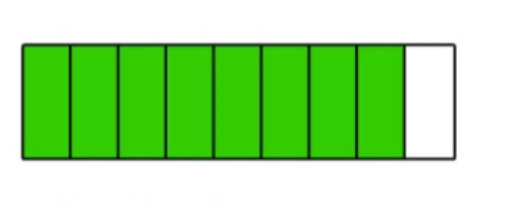 النموذج الشريطي يحتوي على 9 أجزاء متساوية في المجمل، منها 8 أجزاء مظللة، مما يمثل الكسر \(\frac{8}{9}\).