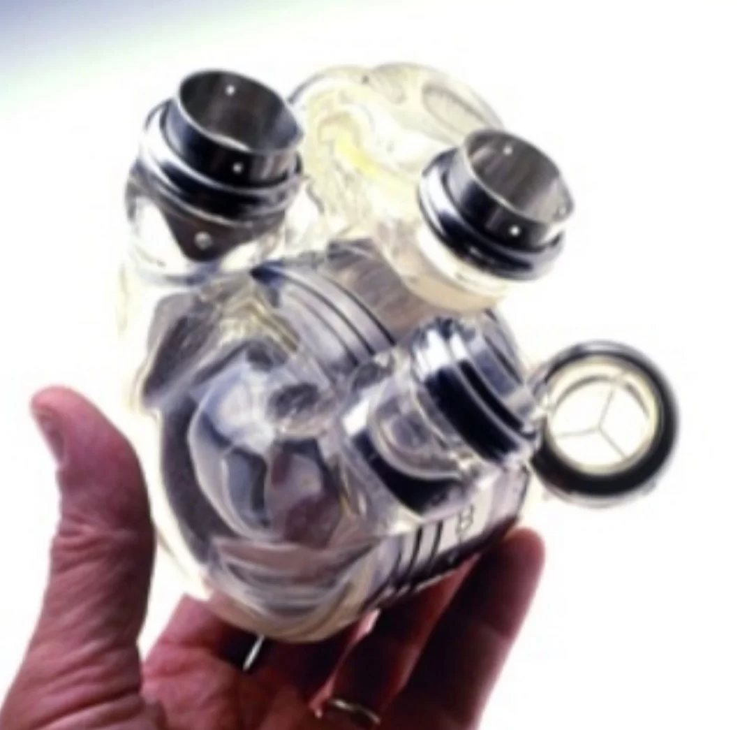 تُظهر الصورة نموذجاً لقلب اصطناعي، وهو جهاز ميكانيكي يحل محل القلب الطبيعي في ضخ الدم داخل جسم الإنسان.