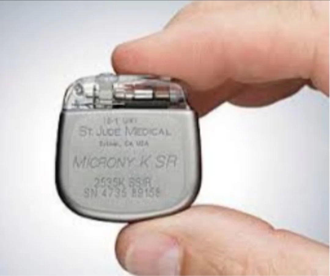 الجهاز المعروض هو منظم لضربات القلب، وهو جهاز طبي تكنولوجي ضروري جداً للحفاظ على حياة الأشخاص الذين يعانون من اضطرابات قلبية.