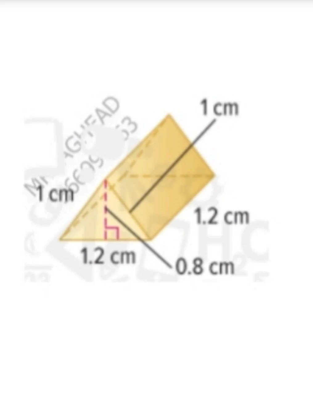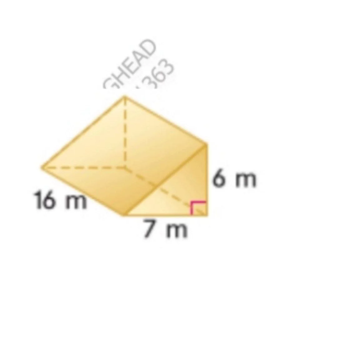 حجم المنشور الثلاثي يساوي مساحة القاعدة في الارتفاع (الطول): \((\frac{1}{2} \times 16 \times 7) \times 6 = 56 \times 6 = 336\).