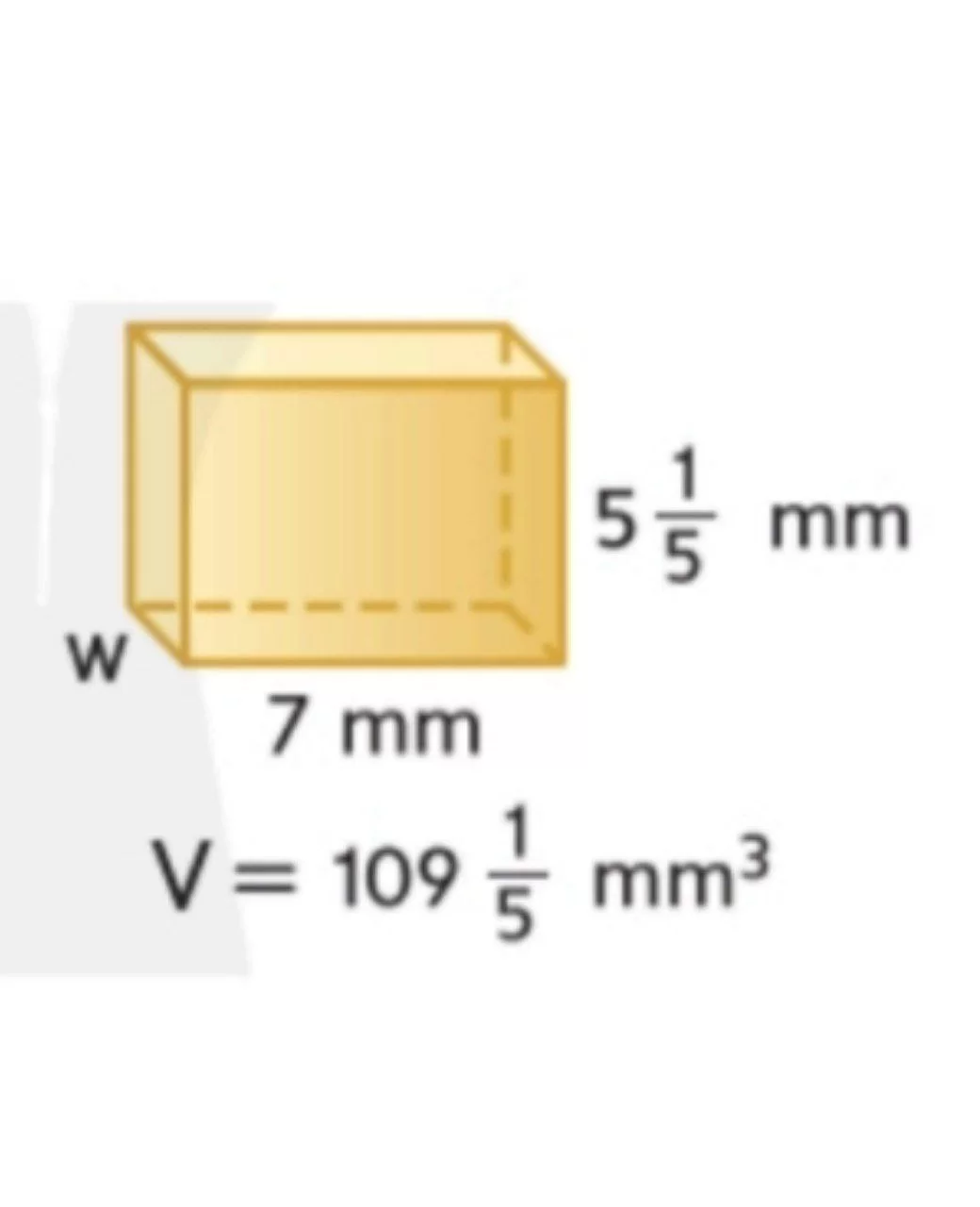 بما أن الحجم \(V = l \times w \times h\)، فإن البعد المفقود \(w = V / (l \times h) = 109.2 / (7 \times 5.2) = 109.2 / 36.4 = 3\).