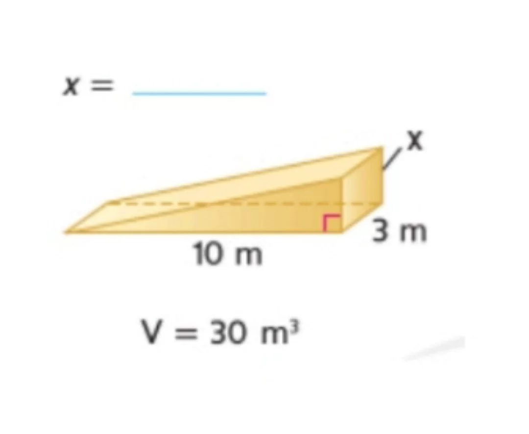 حجم المنشور الثلاثي هو \(V = (\frac{1}{2} \times b \times h) \times L\). بالتعويض: \(30 = (\frac{1}{2} \times 10 \times 3) \times x \Rightarrow 30 = 15x \Rightarrow x = 2\).