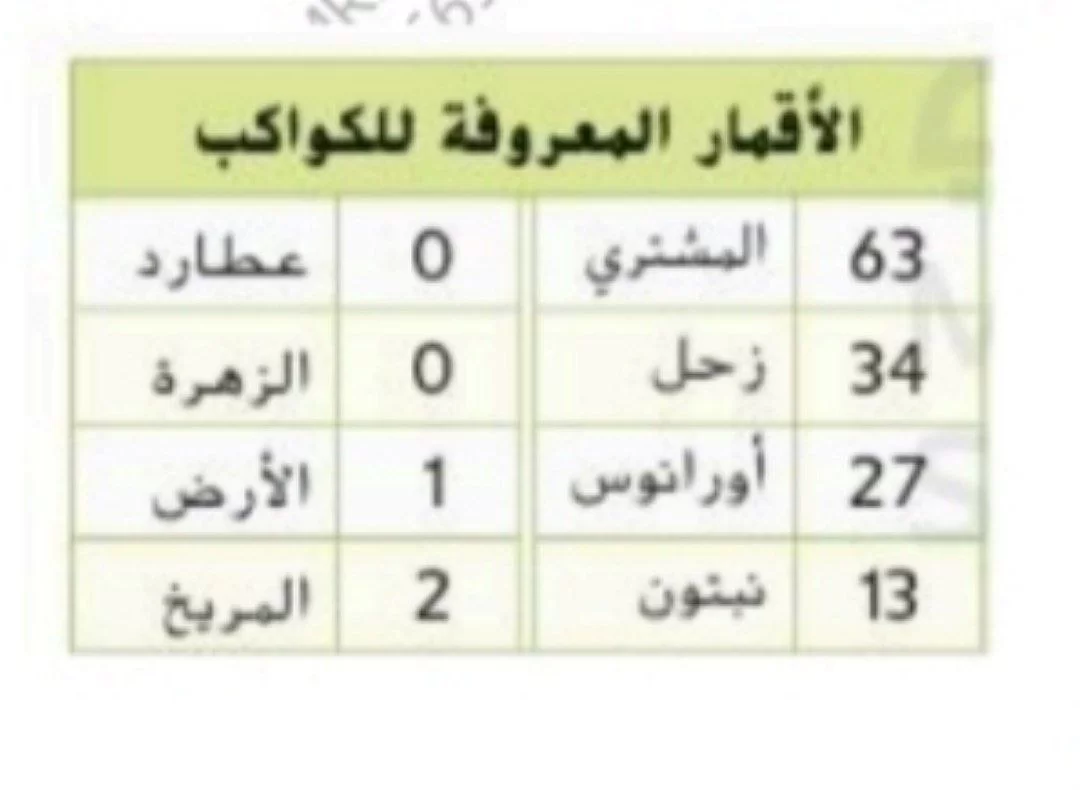 يوضح الجدول التالي عدد الأقمار المعروفة لبعض كواكب المجموعة الشمسية. المدى الربيعي (IQR) لمجموعة هذه البيانات: