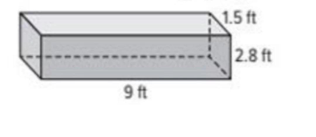 Based on the image labels, the dimensions are 9, 1.5, and 2.8. Volume \(V = 9 \times 1.5 \times 2.8 = 37.8 \text{ ft}^3\).