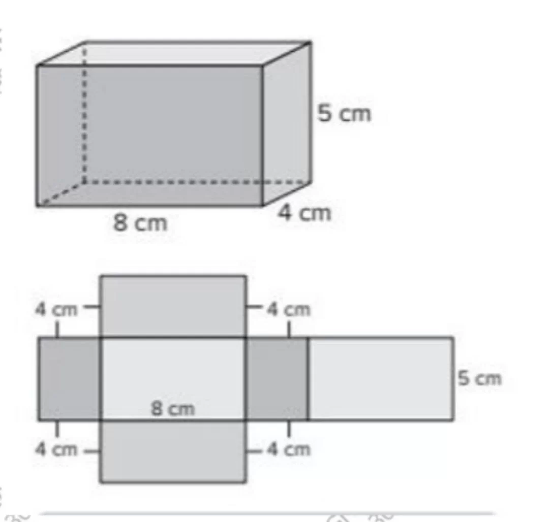 From the net, dimensions are 8 cm, 4 cm, and 5 cm. Total Surface Area = \(2 \times (8 \times 4 + 8 \times 5 + 4 \times 5) = 2 \times (32 + 40 + 20) = 2 \times 92 = 184 \text{ cm}^2\).