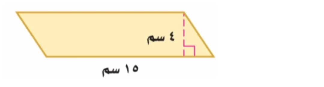 طول القاعدة الموضح 15 سم والارتفاع 4 سم، إذن المساحة = \(15 \times 4 = 60\).