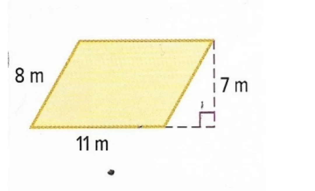 بناءً على الأبعاد الموضحة في الشكل، طول القاعدة يساوي 11 م والارتفاع يساوي 7 م، إذن المساحة = \(11 \times 7 = 77\).