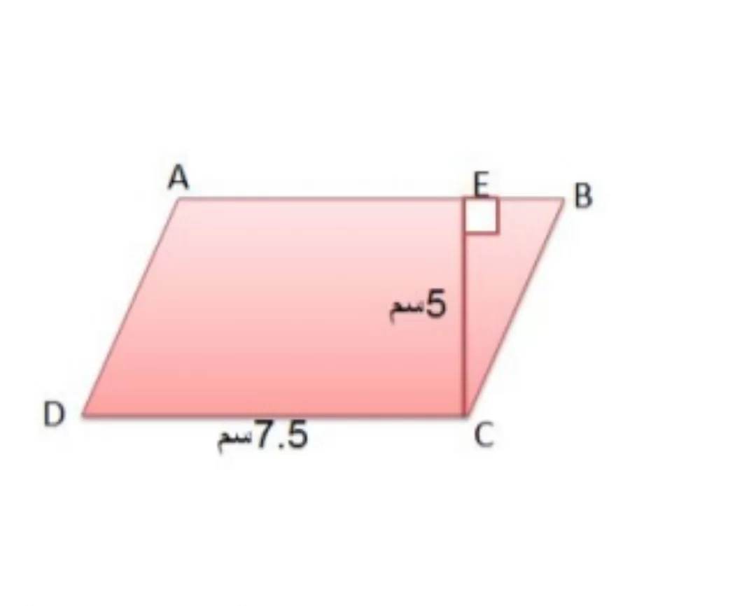 طول القاعدة في الشكل هو 7.5 سم والارتفاع هو 5 سم، إذن المساحة = \(7.5 \times 5 = 37.5\).
