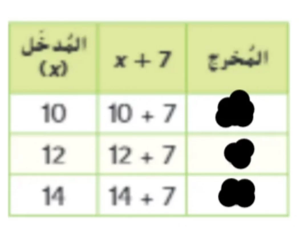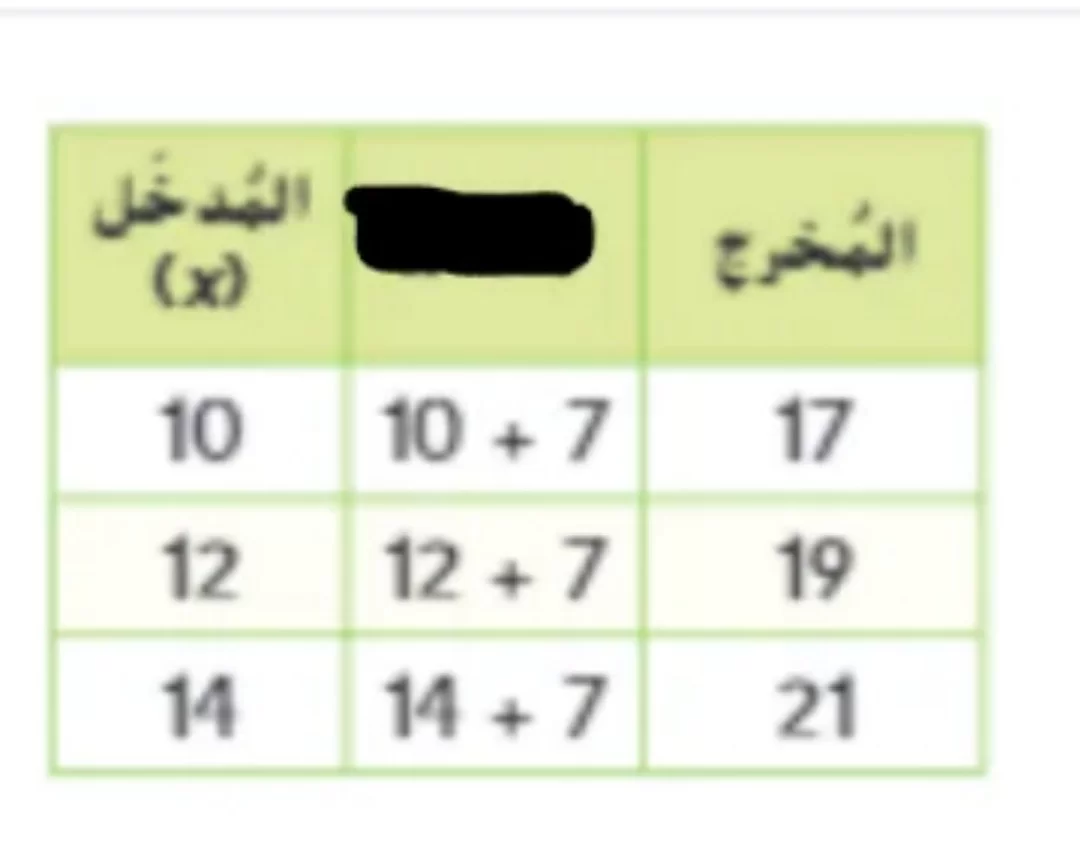 بالنظر إلى الجدول، نلاحظ أن كل مخرج ينتج عن إضافة الرقم 7 إلى المدخل المقابل له (10 + 7 = 17، 12 + 7 = 19، 14 + 7 = 21)، لذا القاعدة هي +7.