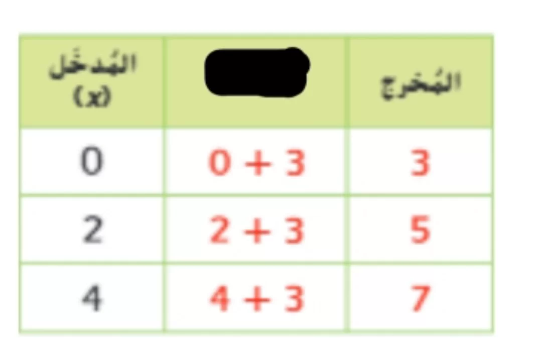 توضح العمليات الحسابية في الجدول أن المخرج هو نتيجة جمع المدخل مع الرقم 3 (0 + 3 = 3، 2 + 3 = 5، 4 + 3 = 7)، وبالتالي القاعدة هي +3.