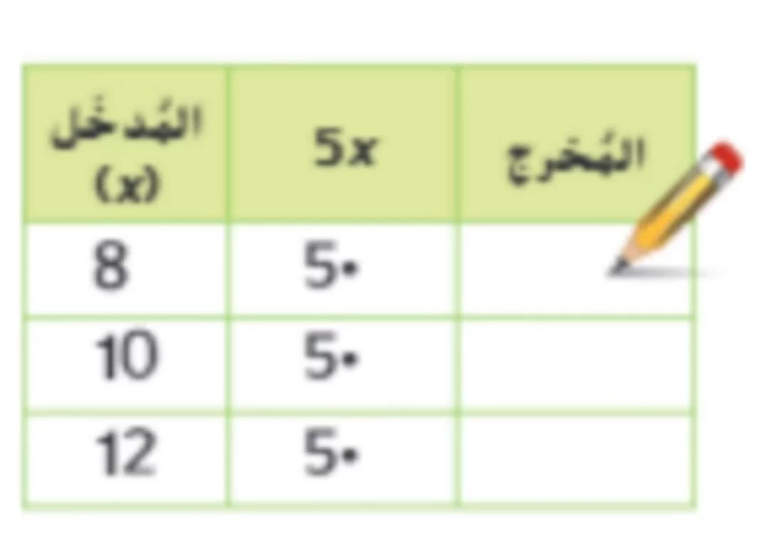 القاعدة المعطاة في الجدول هي \(5x\) (أي ضرب المدخل في 5). بتطبيق القاعدة: \(8 \times 5 = 40\)، و \(10 \times 5 = 50\)، و \(12 \times 5 = 60\). إذن المخرجات هي 40، 50، 60.