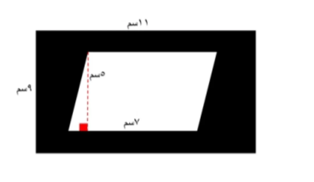 مساحة المستطيل الخارجي تساوي \(11 \times 9 = 99\) سم مربع، ومساحة متوازي الأضلاع الأبيض الداخلي تساوي \(7 \times 5 = 35\) سم مربع. مساحة الجزء المظلل هي الفرق بينهما: \(99 - 35 = 64\) سم مربع.