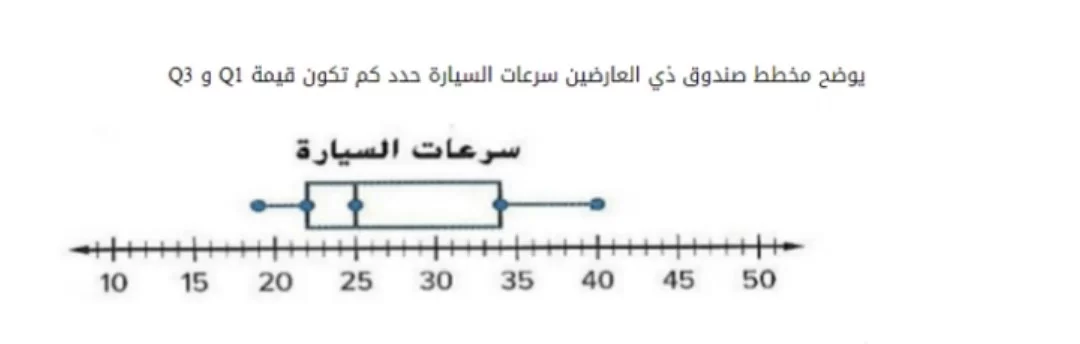 يوضح مخطط صندوق ذي العارضين سرعات السيارة حدد كم تكون قيمة Q1 و Q3