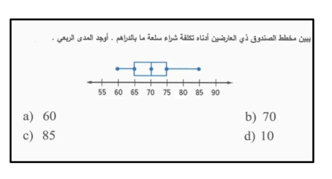 المدى الربيعي (IQR) هو الفرق بين الربيع الثالث والربيع الأول. من المخطط، الربيع الثالث (Q3) يساوي 85 والربيع الأول (Q1) يساوي 75، وبالطرح: \( 85 - 75 = 10 \).