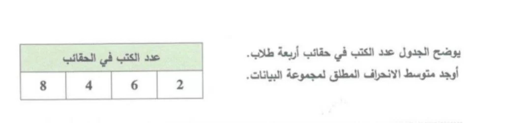 يوضح الجدول عدد الكتب في حقائب أربعة طلاب. أوجد متوسط الانحراف المطلق لمجموعة البيانات: 8، 4، 6، 2
