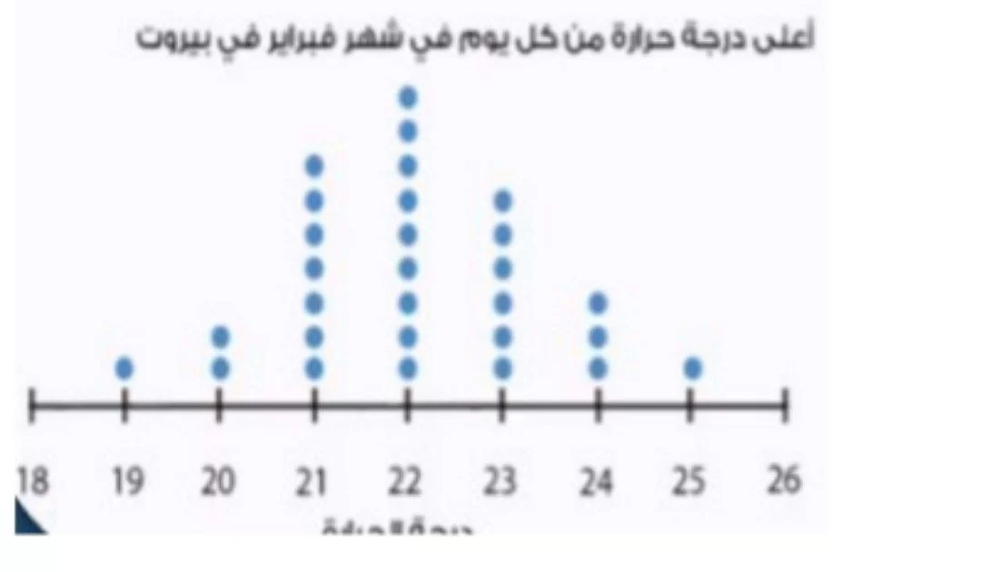 القمة في مخطط النقاط المجمعة هي القيمة التي تمتلك أكبر عدد من النقاط فوقها، وهي هنا عند القيمة 22.